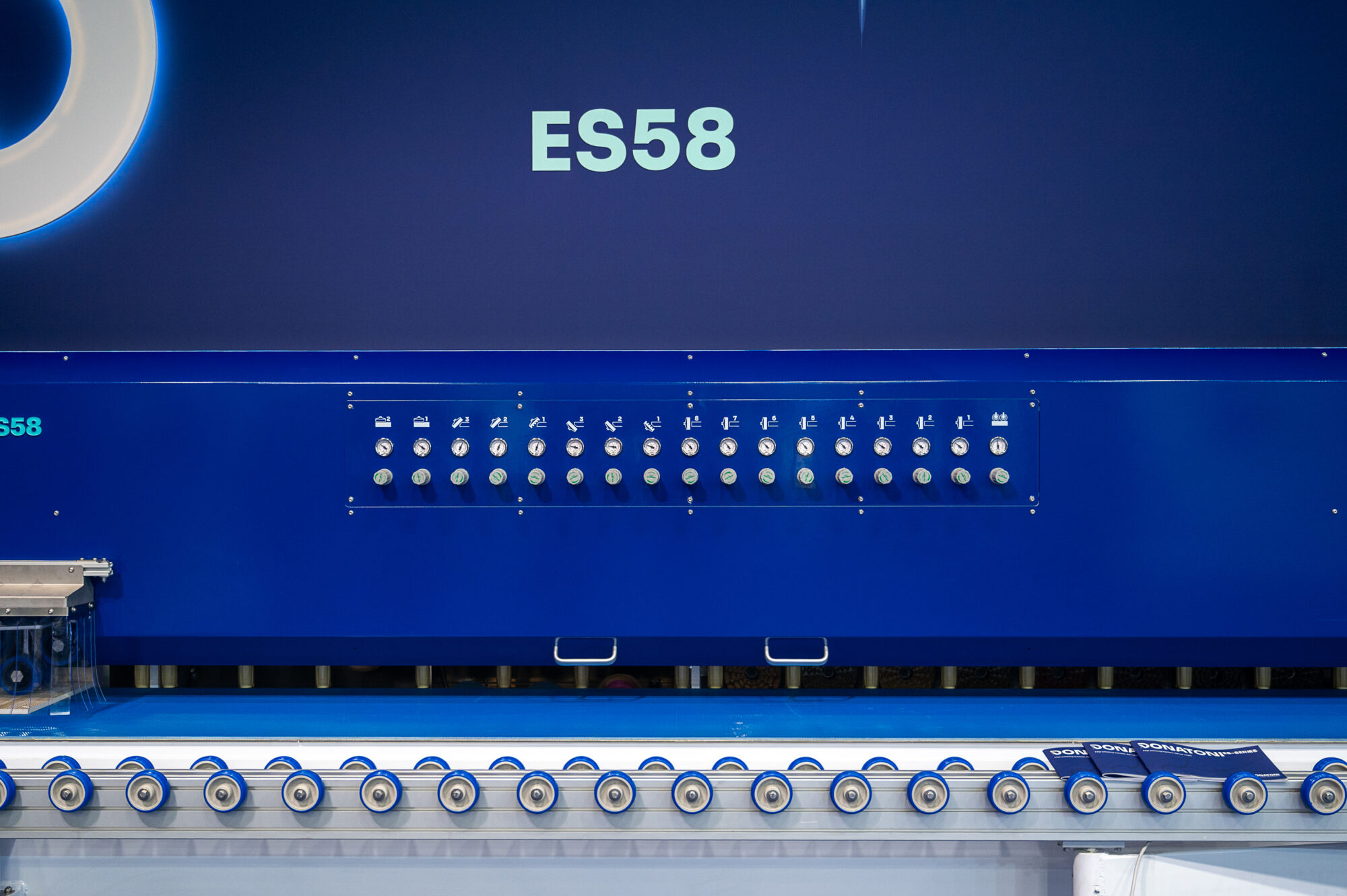 DONATONI ES58 es la nueva pulidora de cantos planos, con un banco de 5800 mm, que dispone de posicionamiento automático de las distintas unidades de procesamiento en función del tipo de material, el grosor y el procesamiento requeridos. El grosor máximo de trabajo es de 50 mm y el número de dispositivos configurables es 20.